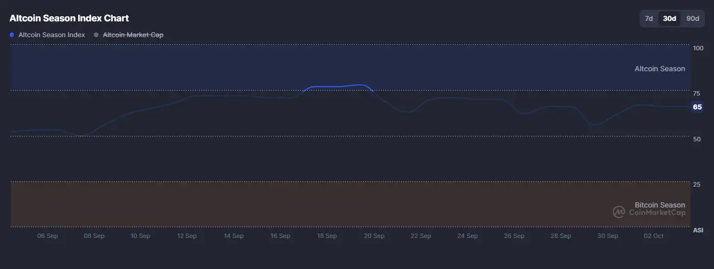 According to CoinMarketCap’s “Altcoin Season Index,” which measures the performance of the top 100 altcoins against Bitcoin, the index has remained just below the 75 threshold during the week, currently resting at 65. This suggests a healthy upward momentum, and traders will be closely monitoring this index for further signs of altcoin dominance.